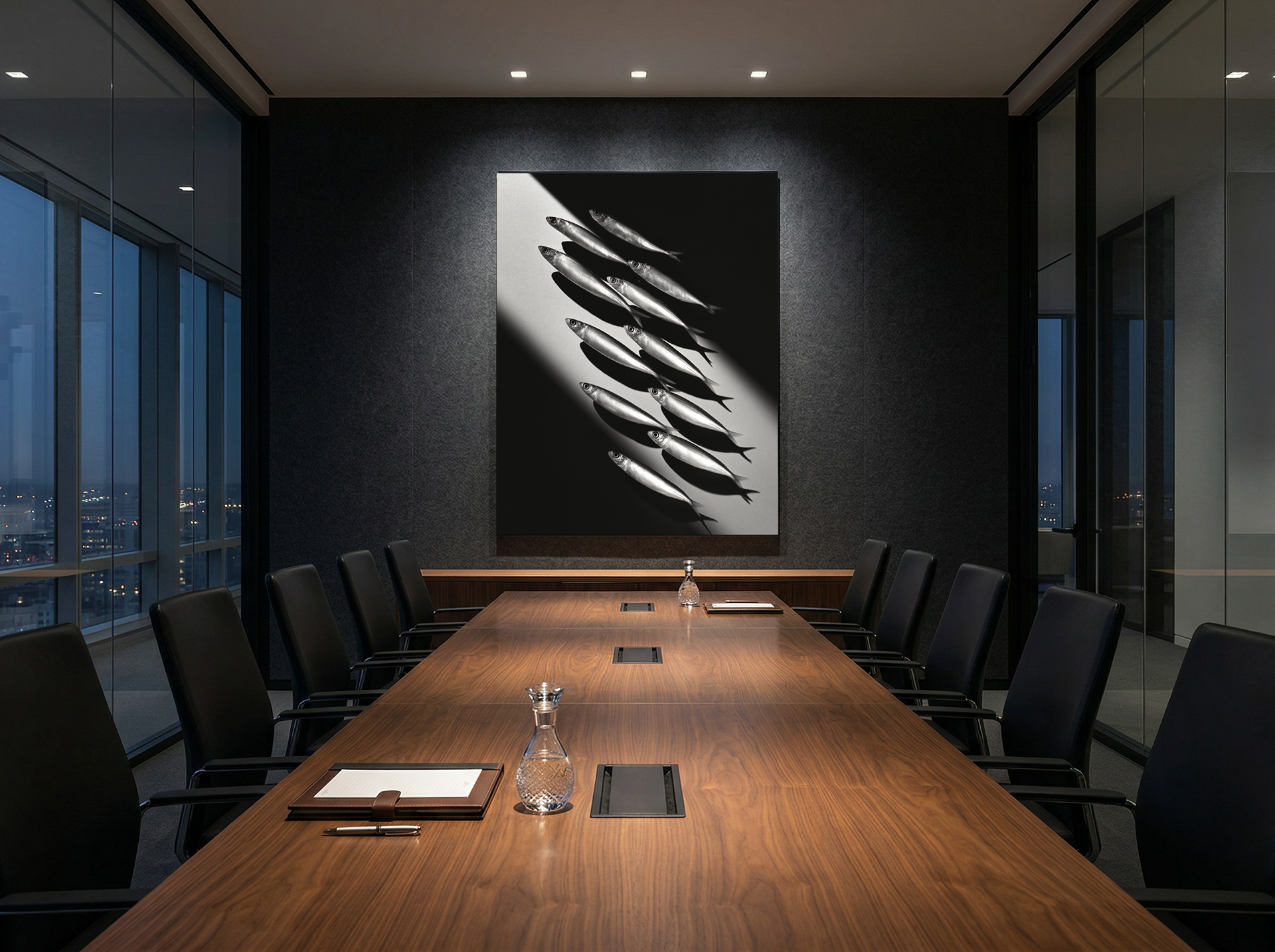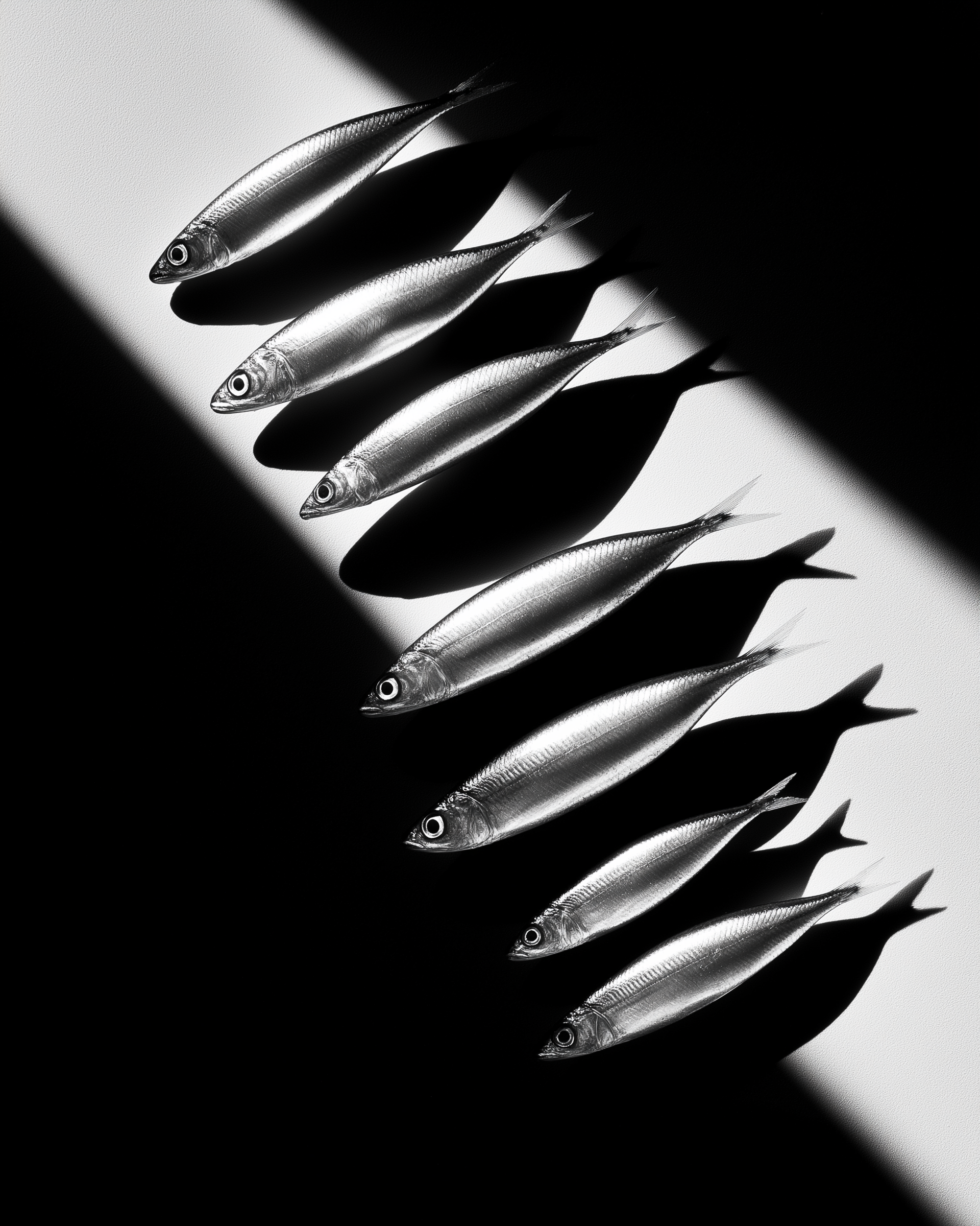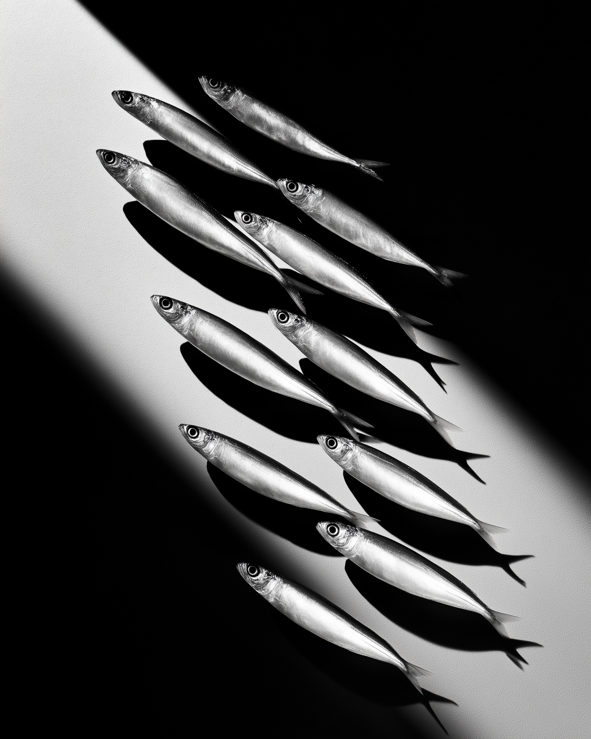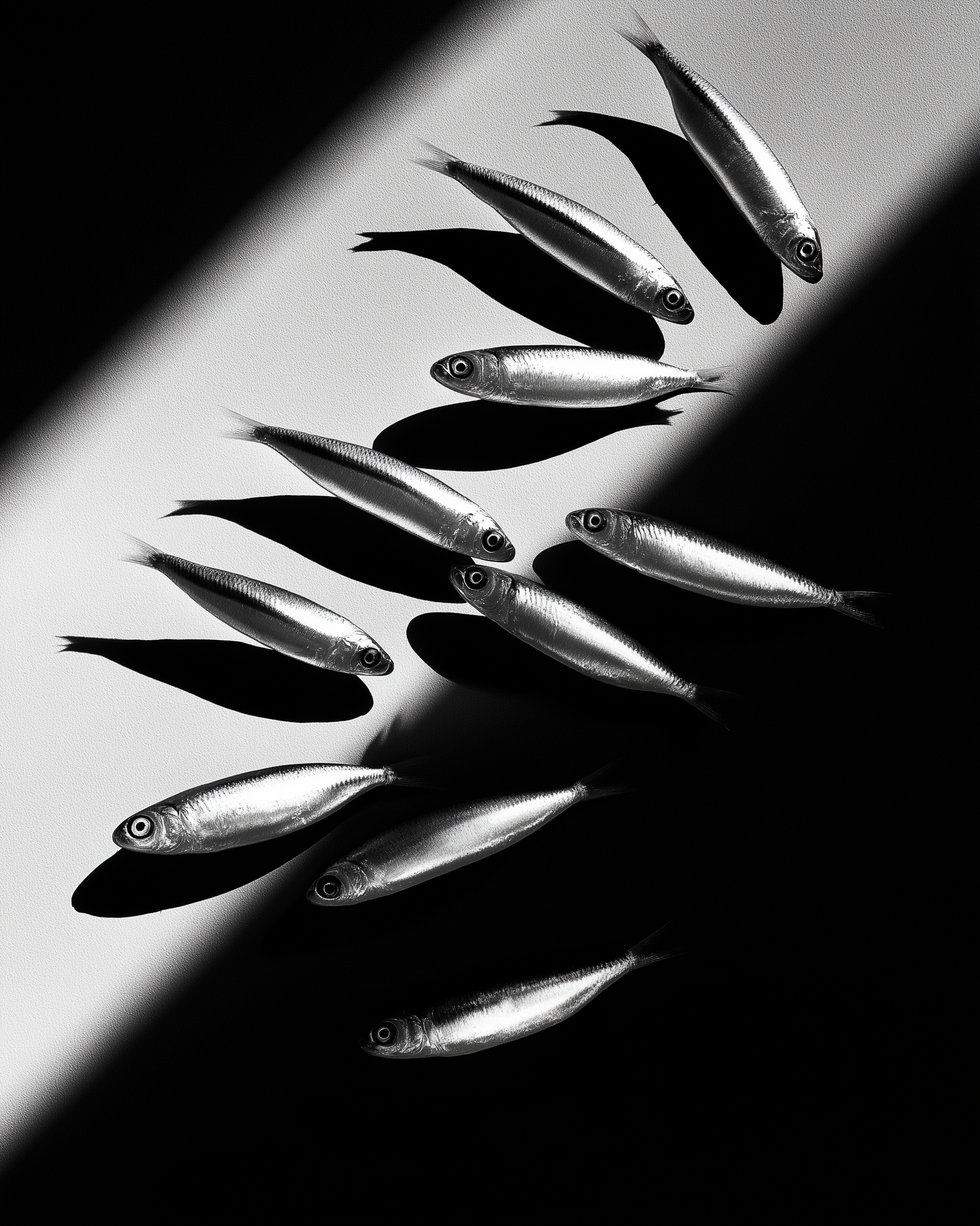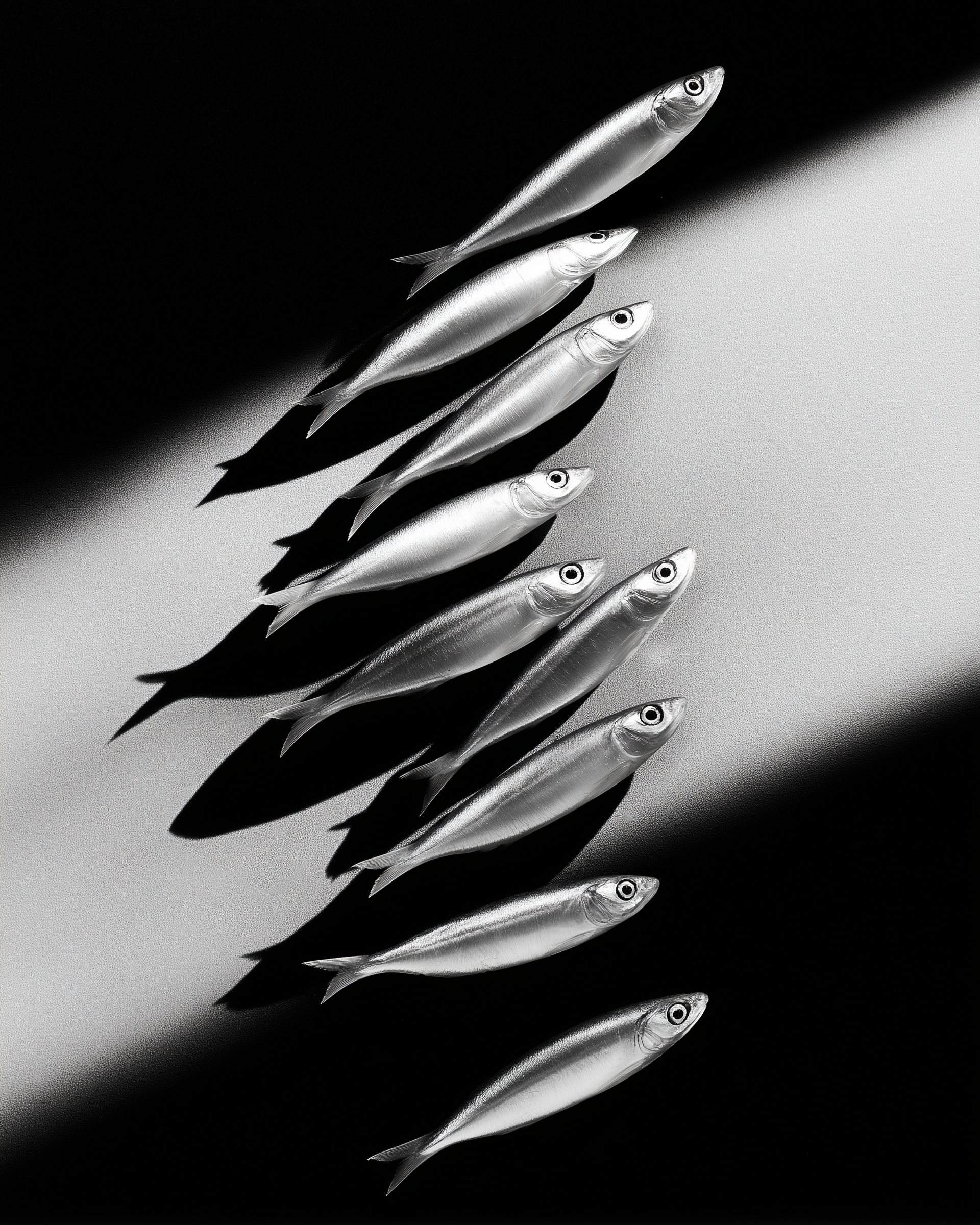 The series explores the tension between order and dissolution, between collective motion and individual form. The sardines appear like calligraphic traces – rhythmic, fragile, almost musical. A silent dance score of light, shadow, and form.