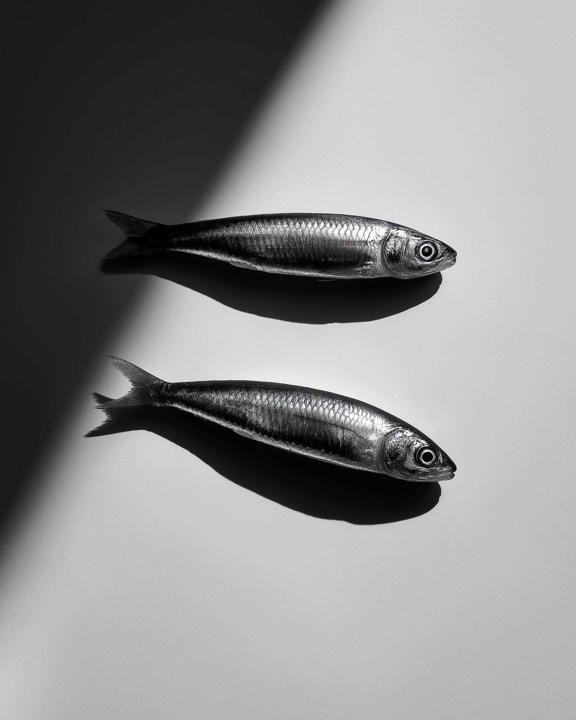 Die Sardinen erscheinen wie kalligrafische Spuren – rhythmisch, fragil, beinahe musikalisch. Eine stille Tanzpartitur aus Licht, Schatten und Form.