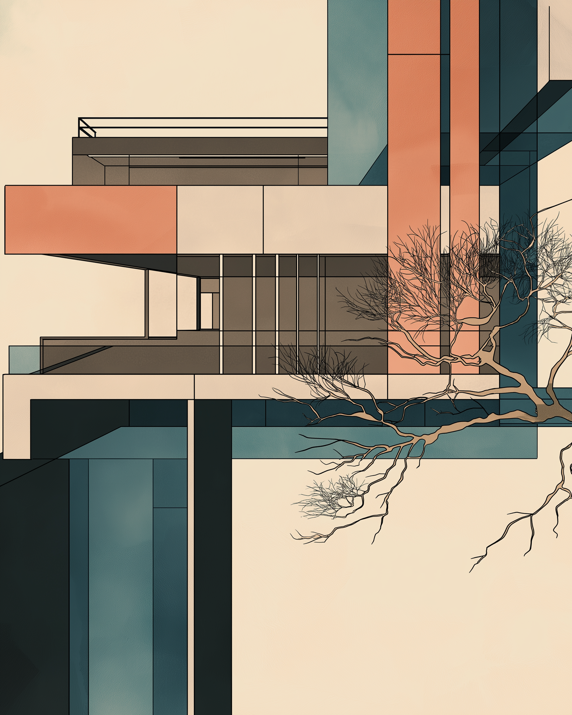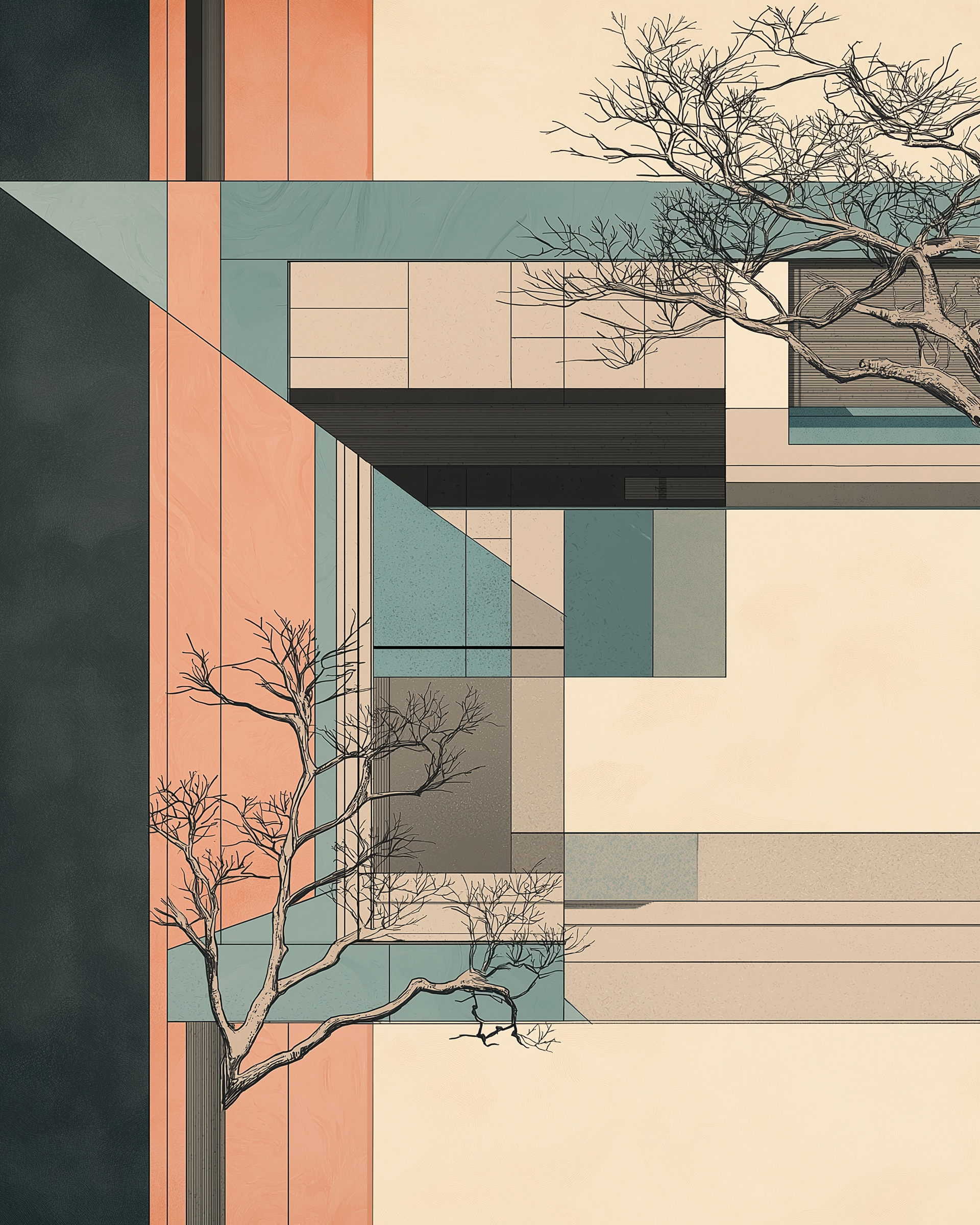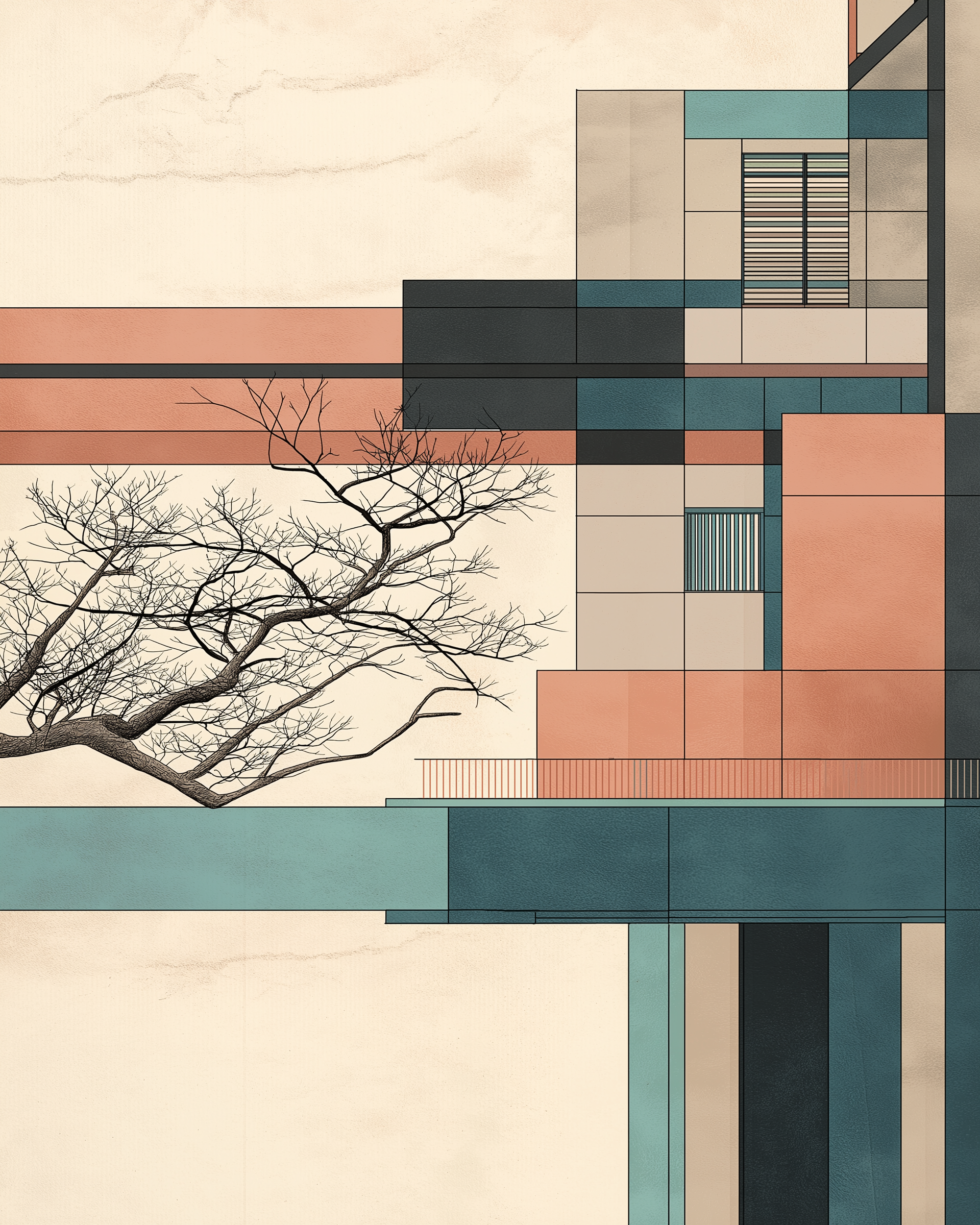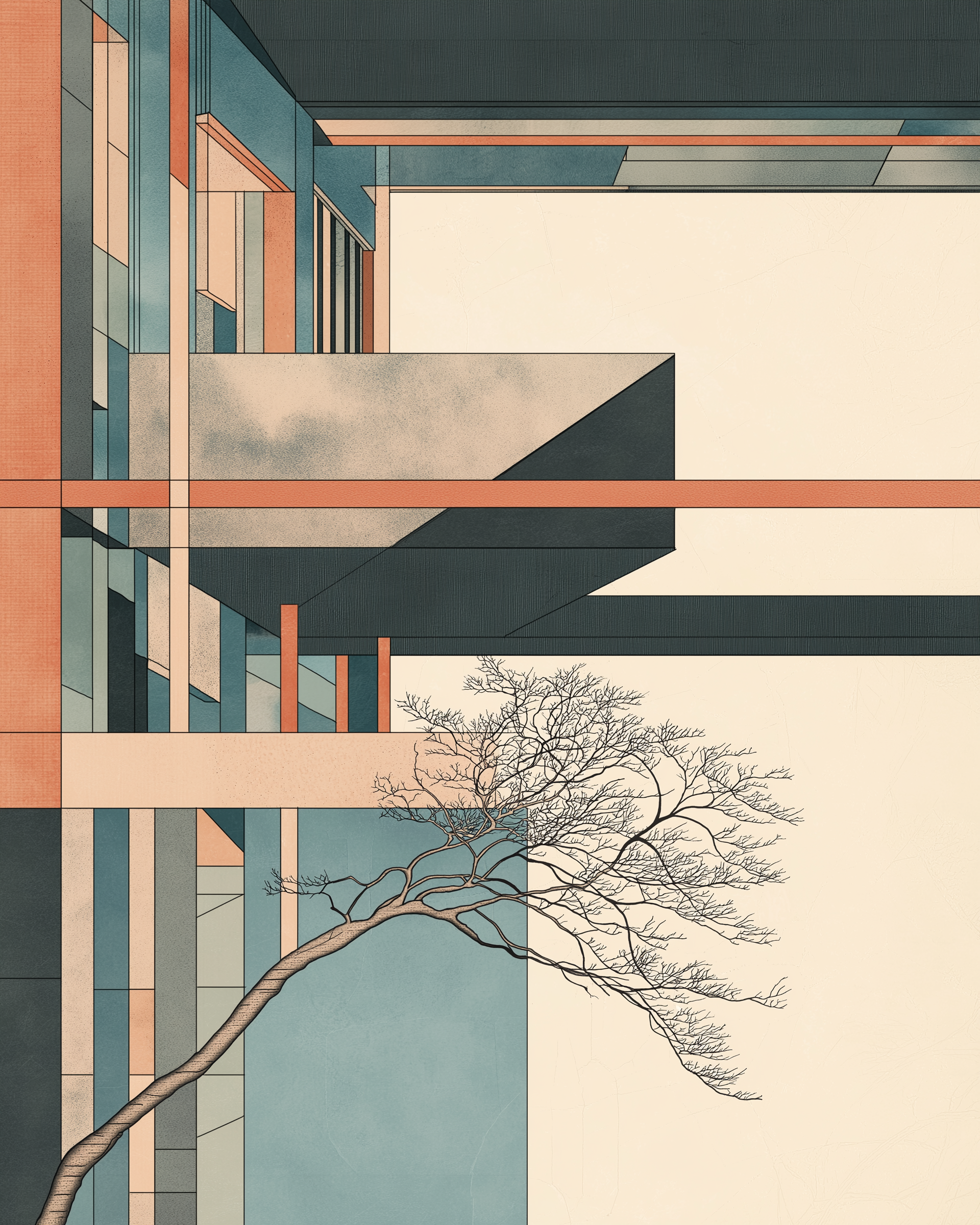 Concrete Ukiyo is a series of eight digital compositions that merge the radical clarity of Bauhaus architecture with the delicate aesthetics of Japanese Ukiyo-e. Planes, shadows, and volumes are arranged like woodcut layers, reducing architecture to poetic surfaces.