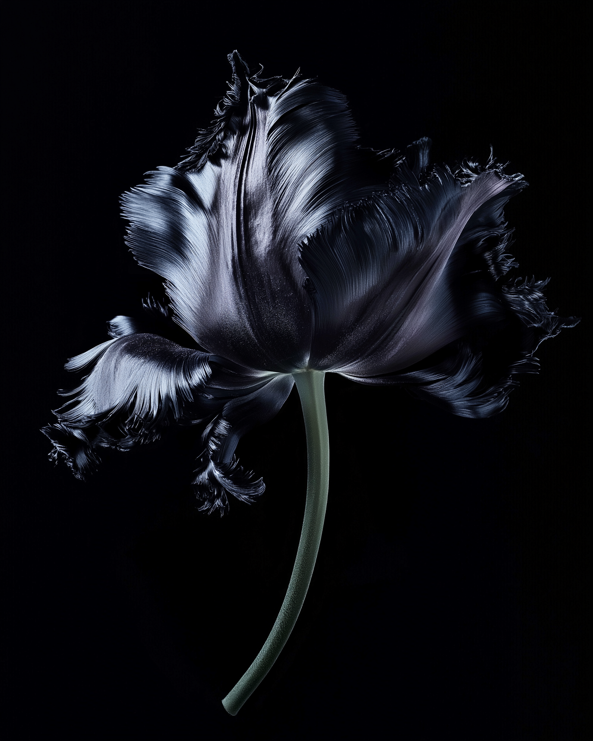 Die schwarzen Tulpen erscheinen nicht lebendig oder welk, sondern zeitlos: eingefroren zwischen Verblühen und Ewigkeit. Eine stille Hommage an die Schönheit des Vergänglichen.