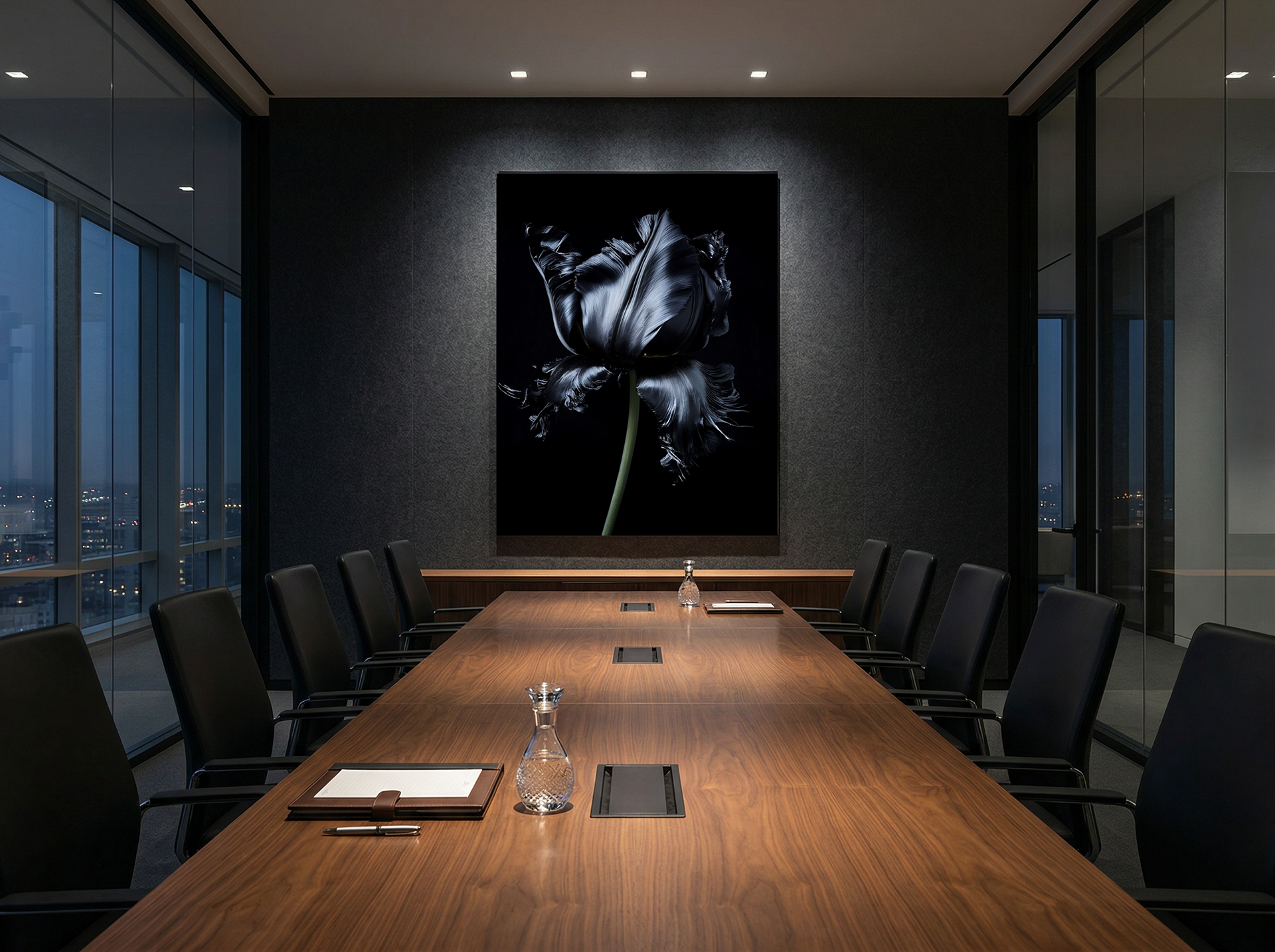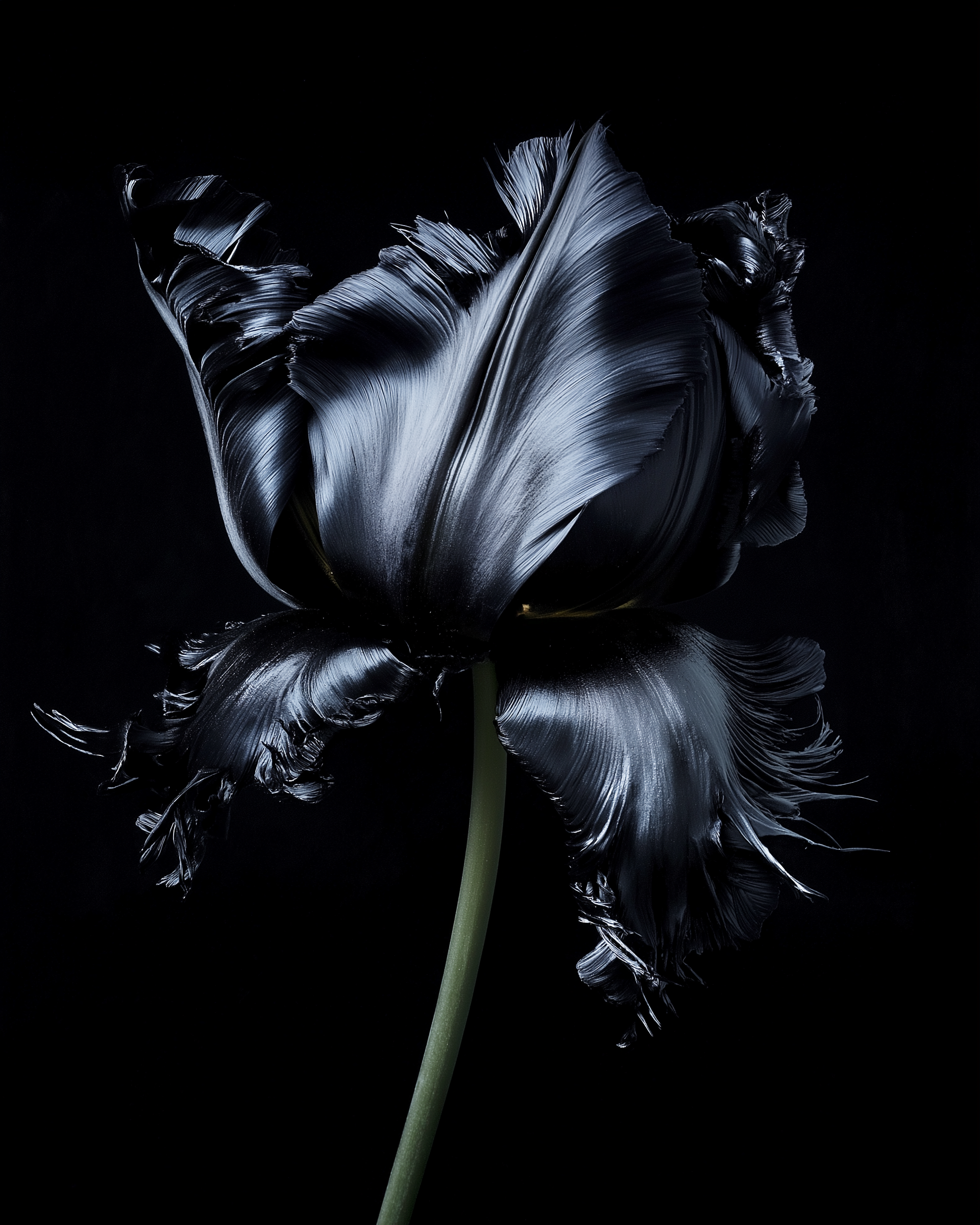 The black tulips appear neither alive nor withered, but timeless: suspended between decay and eternity. A quiet homage to the beauty of transience.