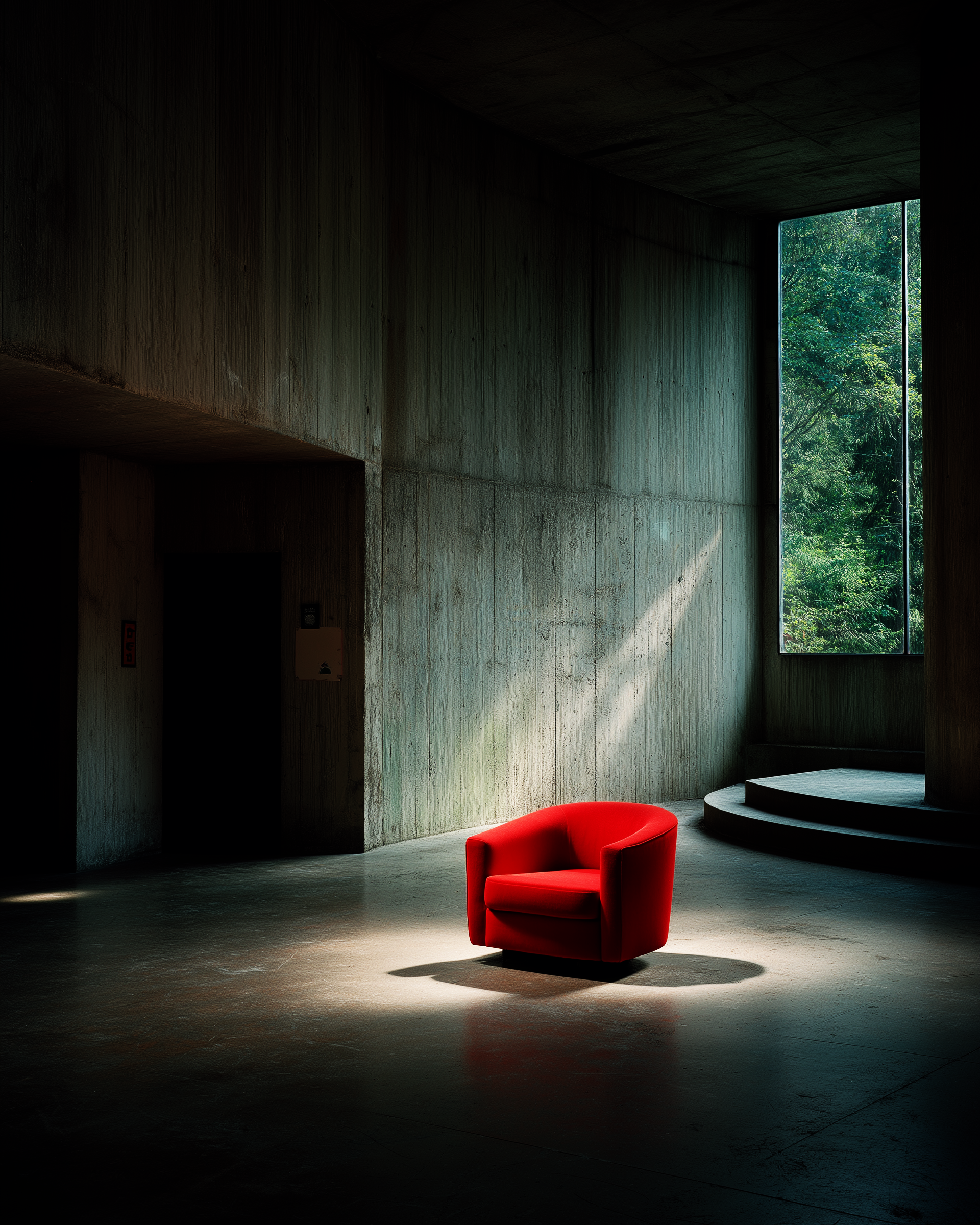 In this photographic series, a single red chair becomes the protagonist within vast brutalist architectural spaces. The object appears both alien and anchoring, structuring the void. Through the interplay of light and shadow, concrete and nature, quiet scenes emerge that oscillate between intimacy and monumentality. These works speak of solitude, presence, and the paradoxical dialogue between human absence and architectural permanence.
