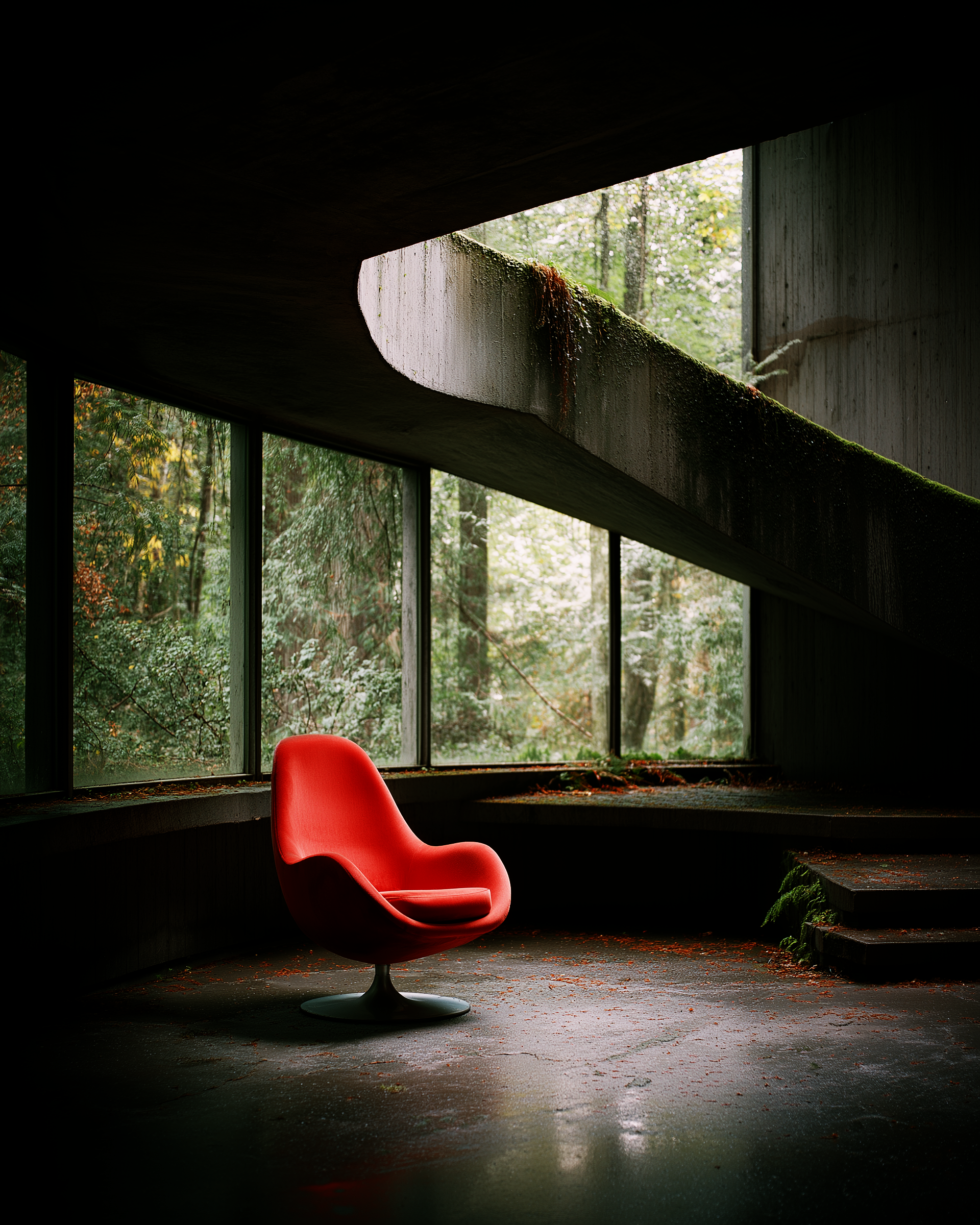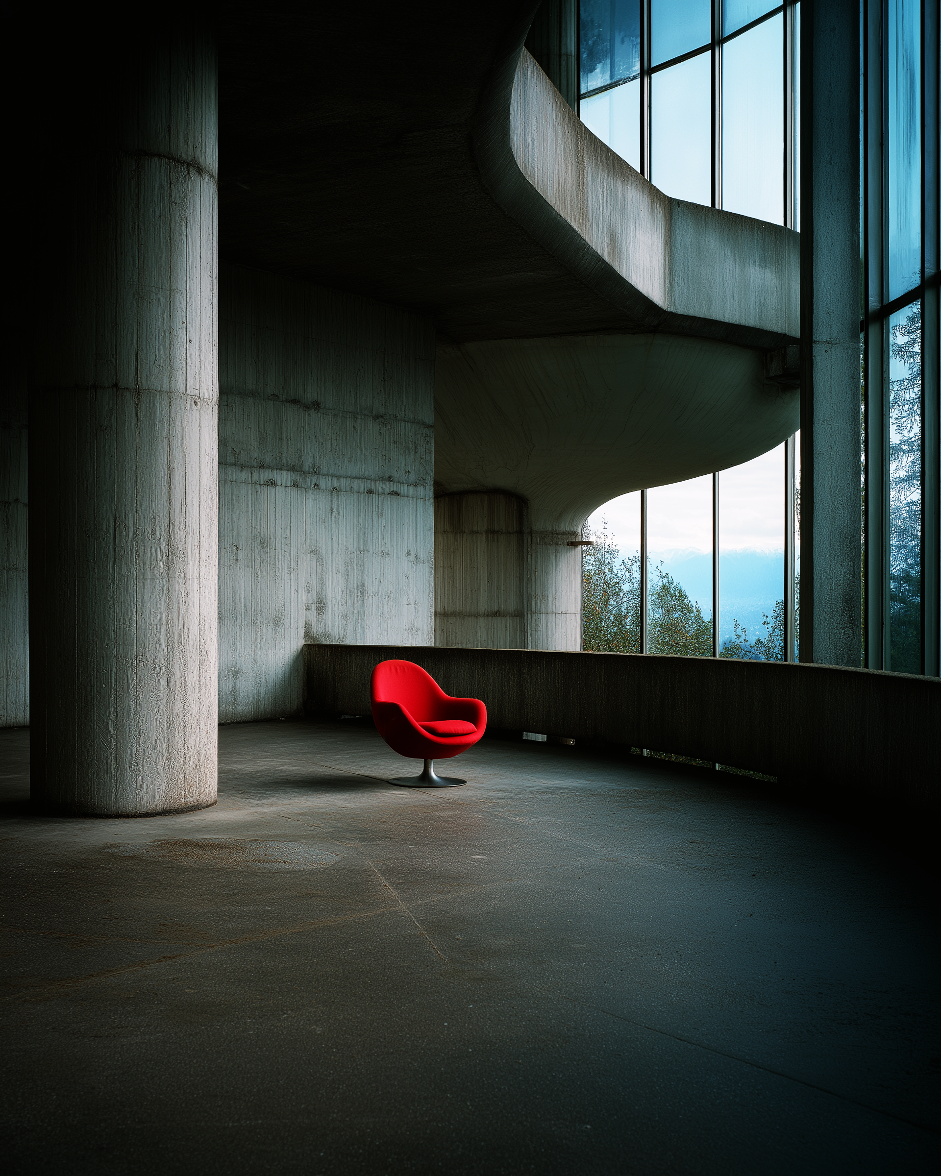 In dieser fotografischen Serie wird ein einzelner roter Stuhl zum Protagonisten in weitläufigen, brutalistischen Architekturräumen. Das Möbelstück wirkt wie ein Fremdkörper und zugleich wie ein Anker, der die Leere strukturiert. Durch das Wechselspiel von Licht und Schatten, Beton und Natur, entstehen stille Szenen, die zwischen Intimität und Monumentalität oszillieren. Die Arbeiten erzählen von Einsamkeit, Präsenz und dem paradoxen Dialog zwischen menschlicher Abwesenheit und architektonischer Dauer.